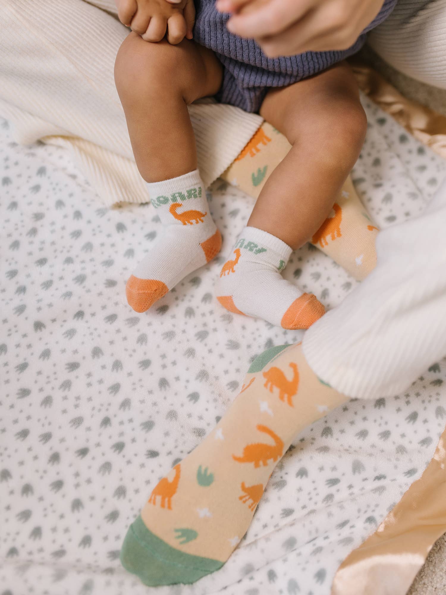 Mom and Baby can have cozy and coordinating feet with the Mama & Me Socks Set from JuJuBe × Studio Oh! Made of polyester and spandex for ultra-comfort, these cute and colorful socks are perfect for photos, lounging around the house, and making a “twinning” fashion statement on the go. The socks feature irresistible, on-trend designs that make a stylish addition to any mama-and-baby ensemble. • Includes a pair of socks for Mom (one size fits most) and a pair for Baby (3 to 12 months) • Features non-slip gripper soles on baby socks Adult socks (one pair): 95% polyester, 5% spandex; one size fits most Baby socks (one pair): 90% polyester, 5% spandex, 5% PVC; 3–12 months Machine washable