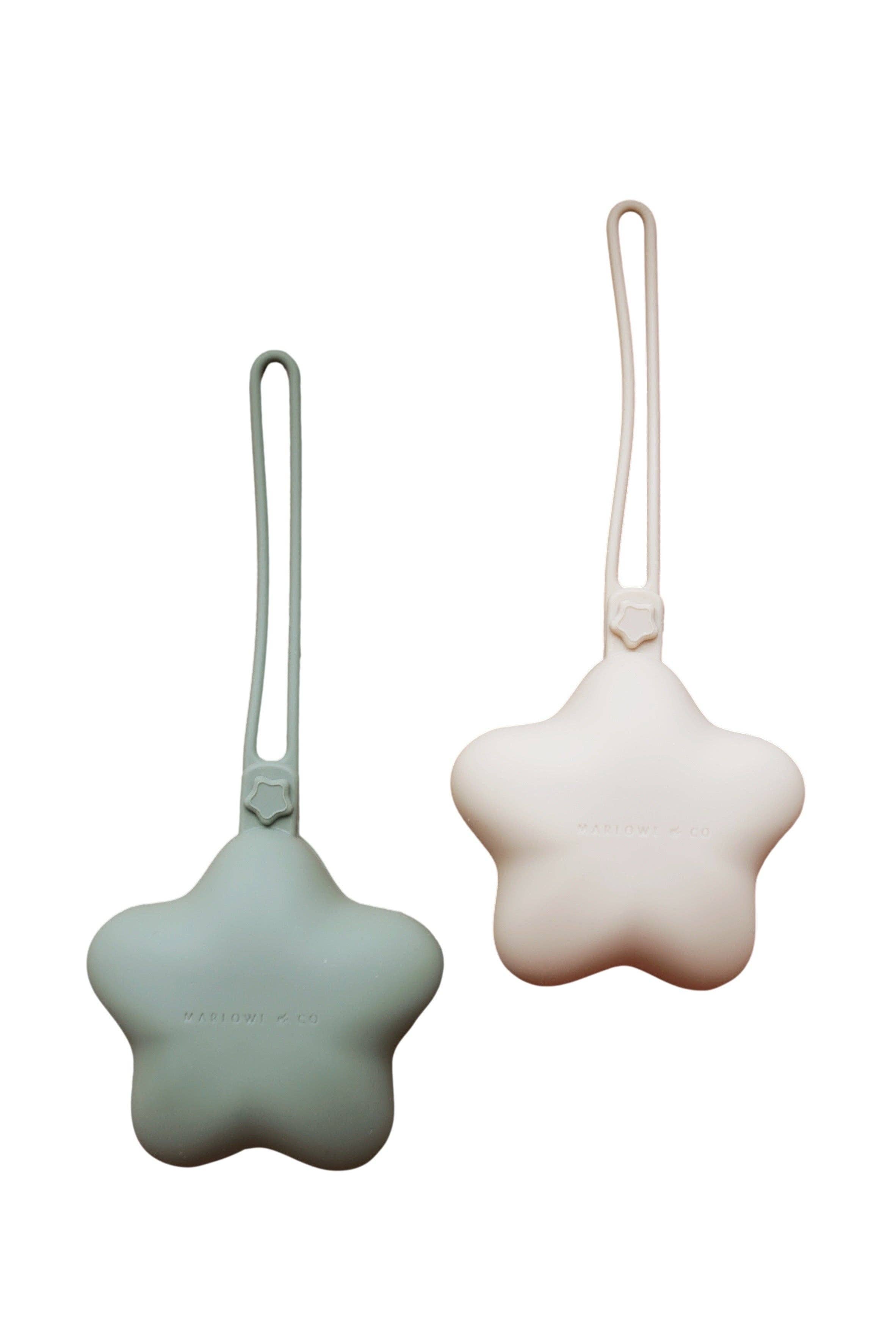 Marlowe & Co’s silicone star pacifier case is a convenient and chic way to keep pacifiers, teethers, and other essential items clean while on the go. As your child grows you can use it for small essentials like lip balm, hair ties, or other small items. Our star pacifier holder features a convenient button closure to ensure all items remain safe, as well as a built-in silicone strap that secures to a diaper bag, car seat, or stroller. This set is a darling gift for a baby boy or girl and is packaged in a giftable box.
