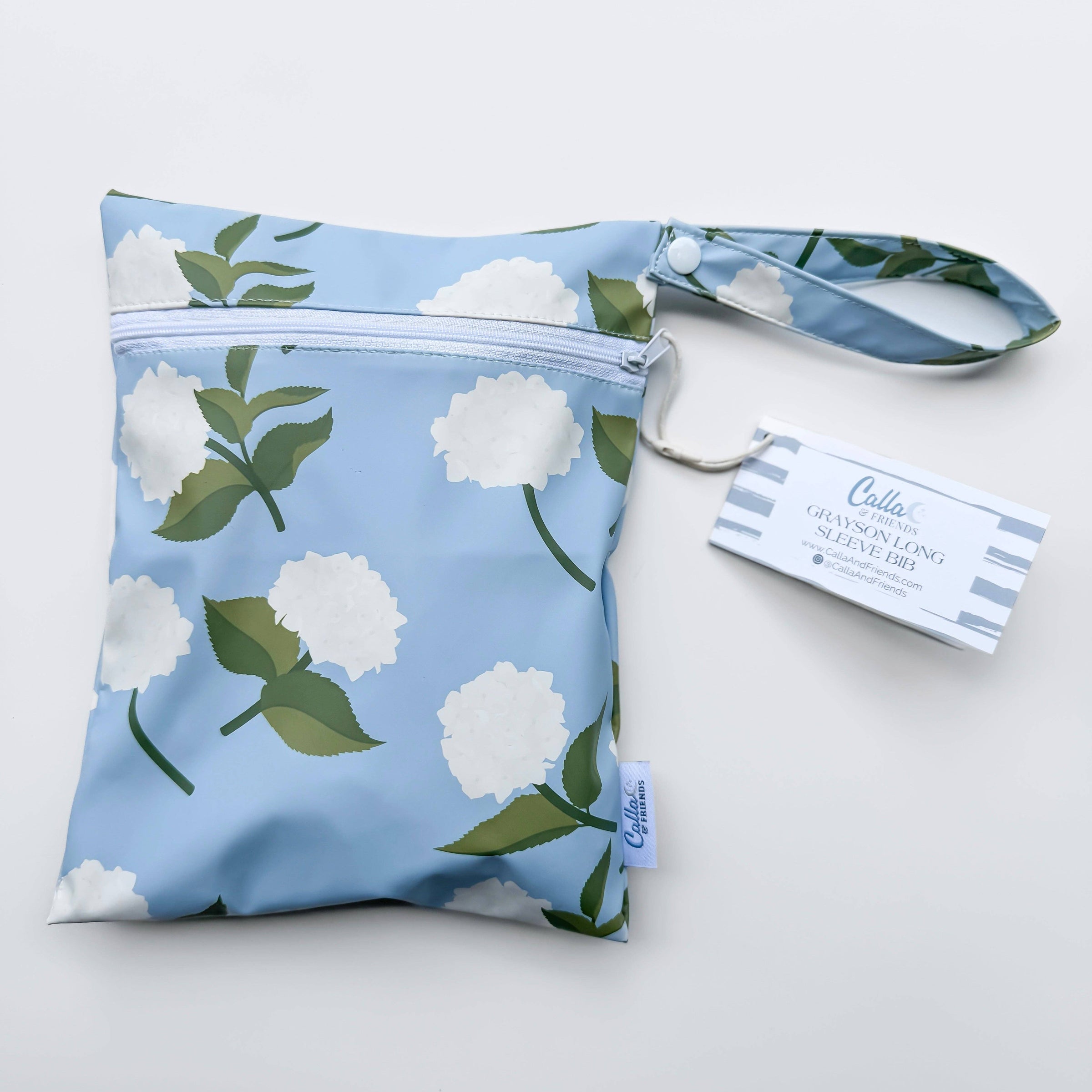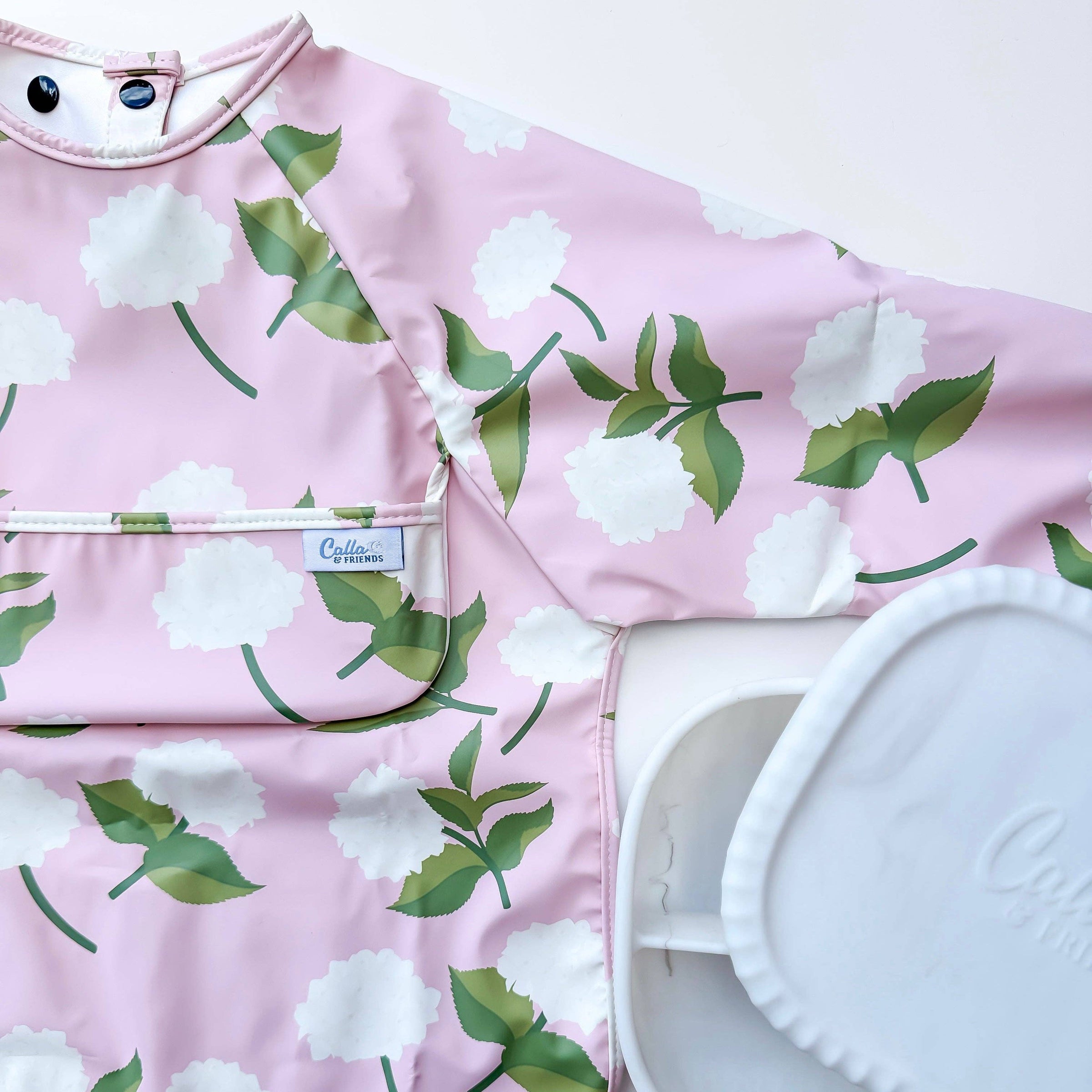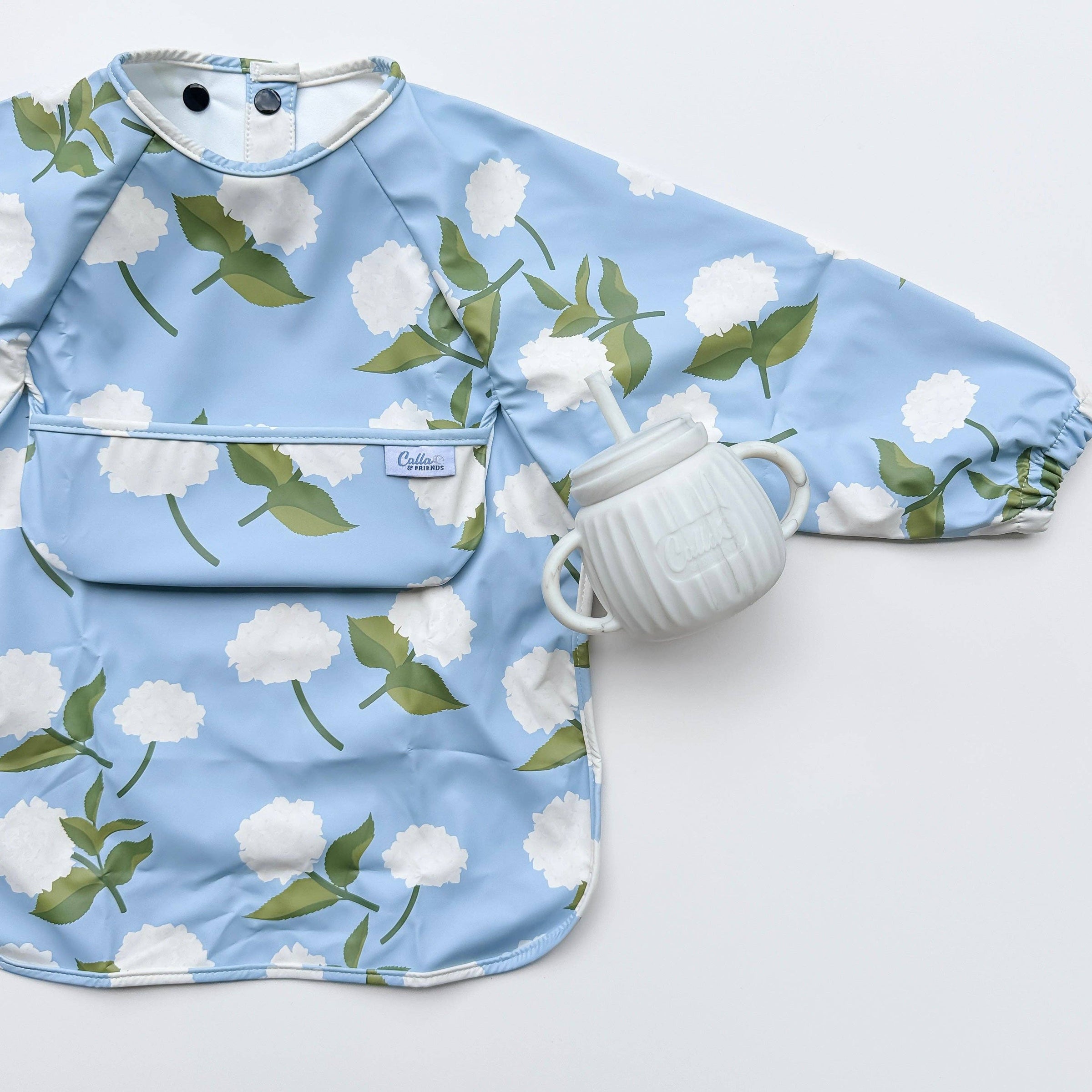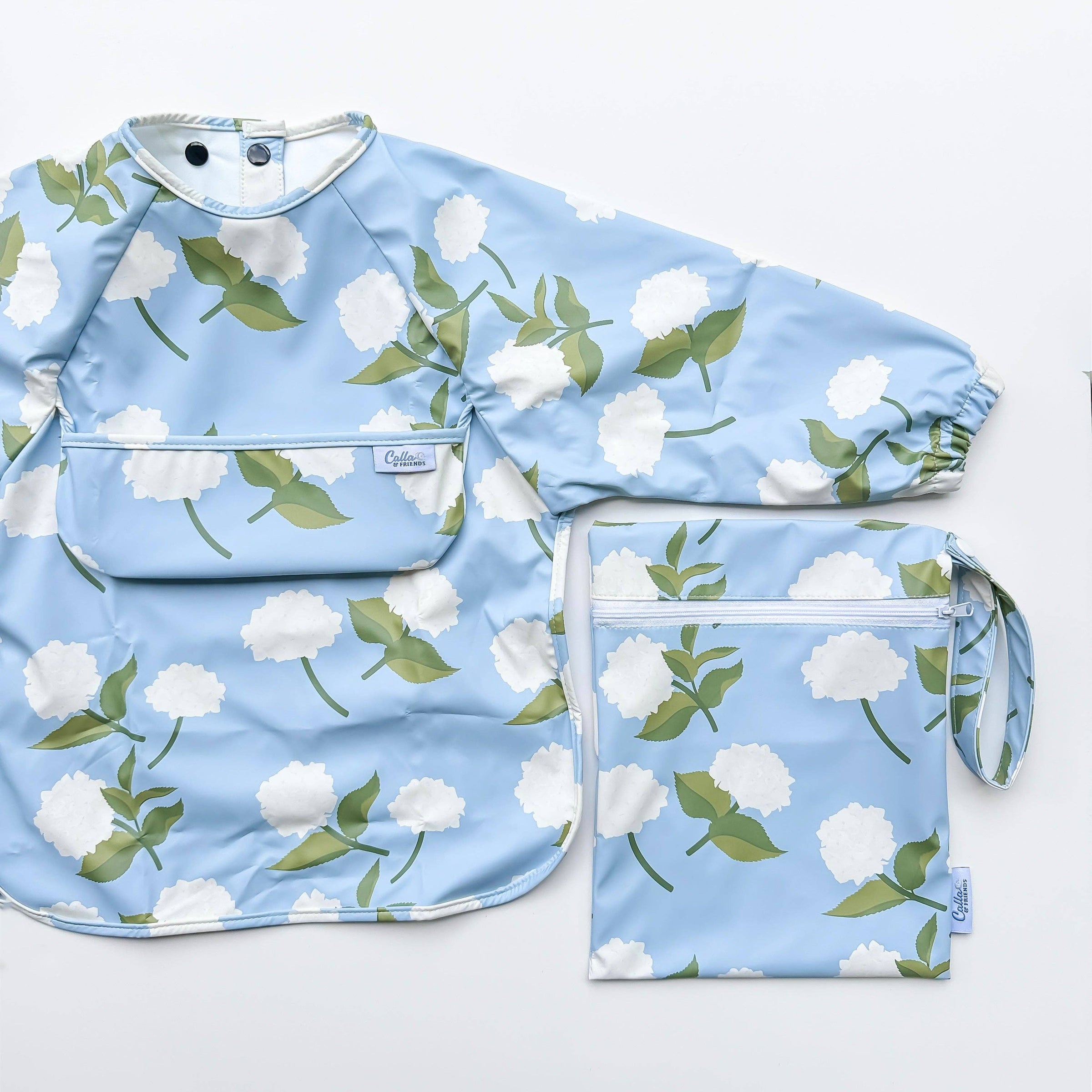 The Ultimate Mess-Saving Solution Perfect for your little one's meal-time, water table adventures, messy crafts, or any other time you want to keep those cute clothes clean. Not only do these long sleeve bibs match all of their cute clothes, they’re also highly functional. Each bib comes in a matching wet/dry bag making it perfect for on the go. Simply place your dirty bib back in its bag & keep your diaper bag clean. With their waterproof design and catch-all pocket, they effortlessly keep your baby's clothes clean and dry. The pocket even folds under to fold flat when not needed for crafts or sensory tables. The multi-snap neck closure & elastic cuffs ensure a secure and adjustable fit that grows with your little one, making them perfect for every stage of their development. - Packaging - Matching wet bag with hangtag.