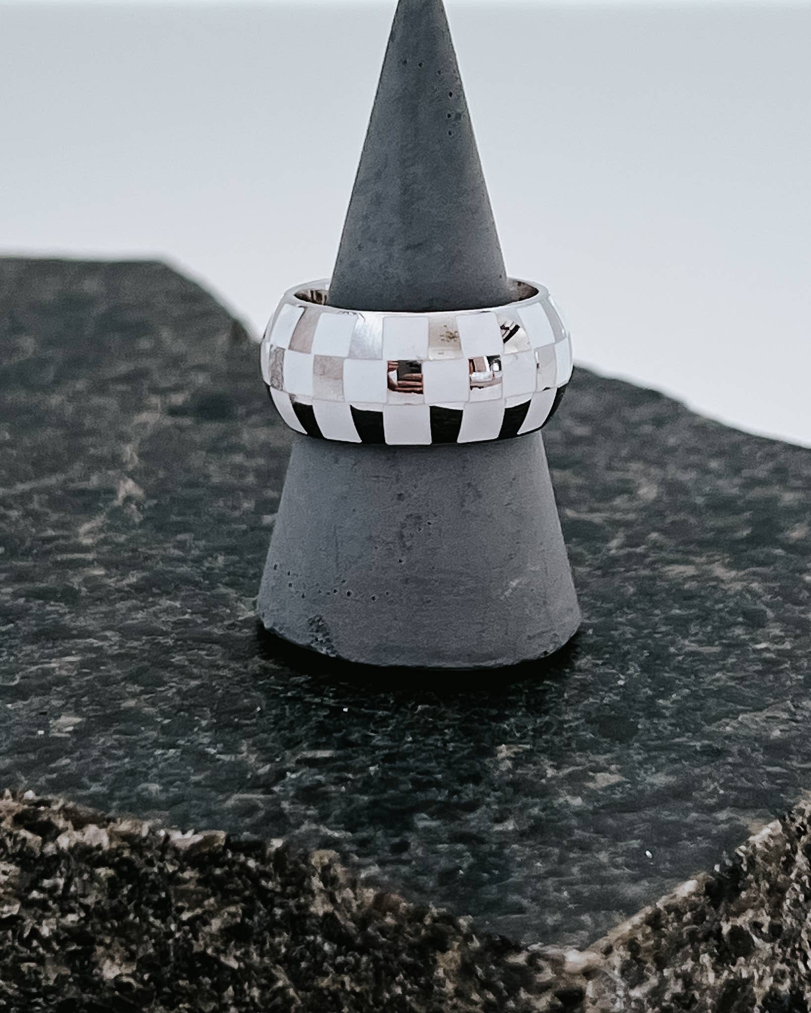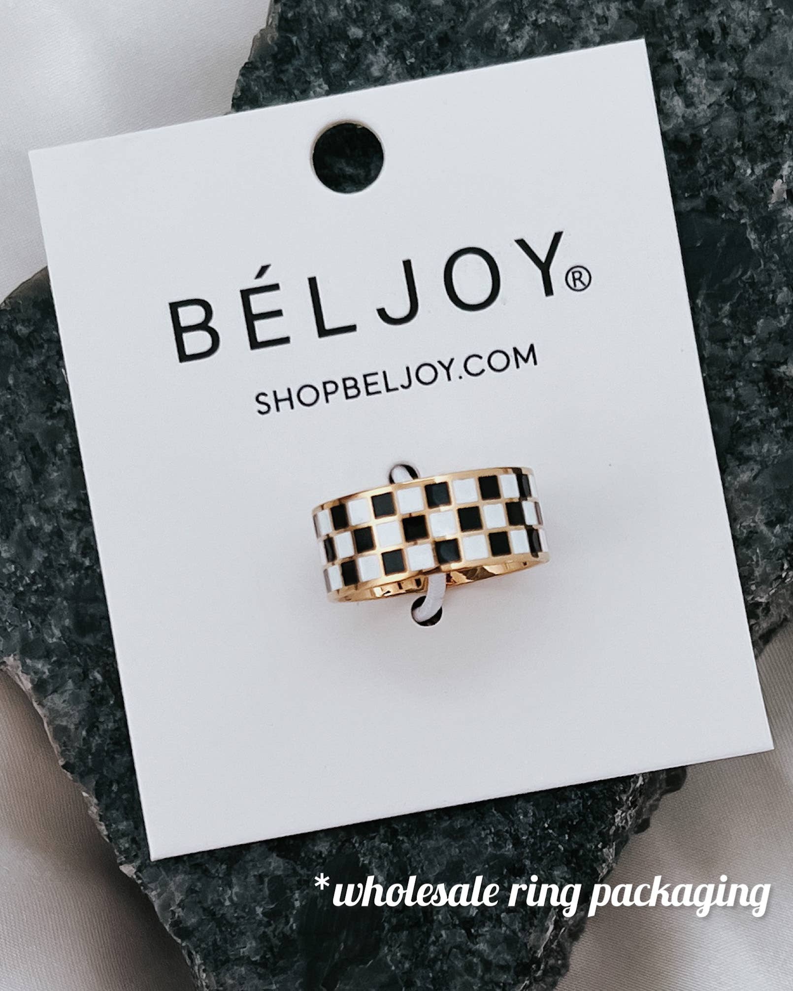 Show off your style with this Ronnie Checkered Ring — a beautiful gold and white or silver and white checkered design, perfect for any occasion. Add a touch of class to your look and make a statement with this stunning piece of jewelry. Make an unforgettable impression today! • Waterproof • Tarnish resistant • 18K Gold plated stainless steel • Hypoallergenic Care tips: • Store jewelry in our cloth Béljoy bag or a small plastic zip lock • Use a jewelry cloth to clean everyday oils off • Avoid contact with chemicals such as hairspray, lotions, perfumes, etc.
