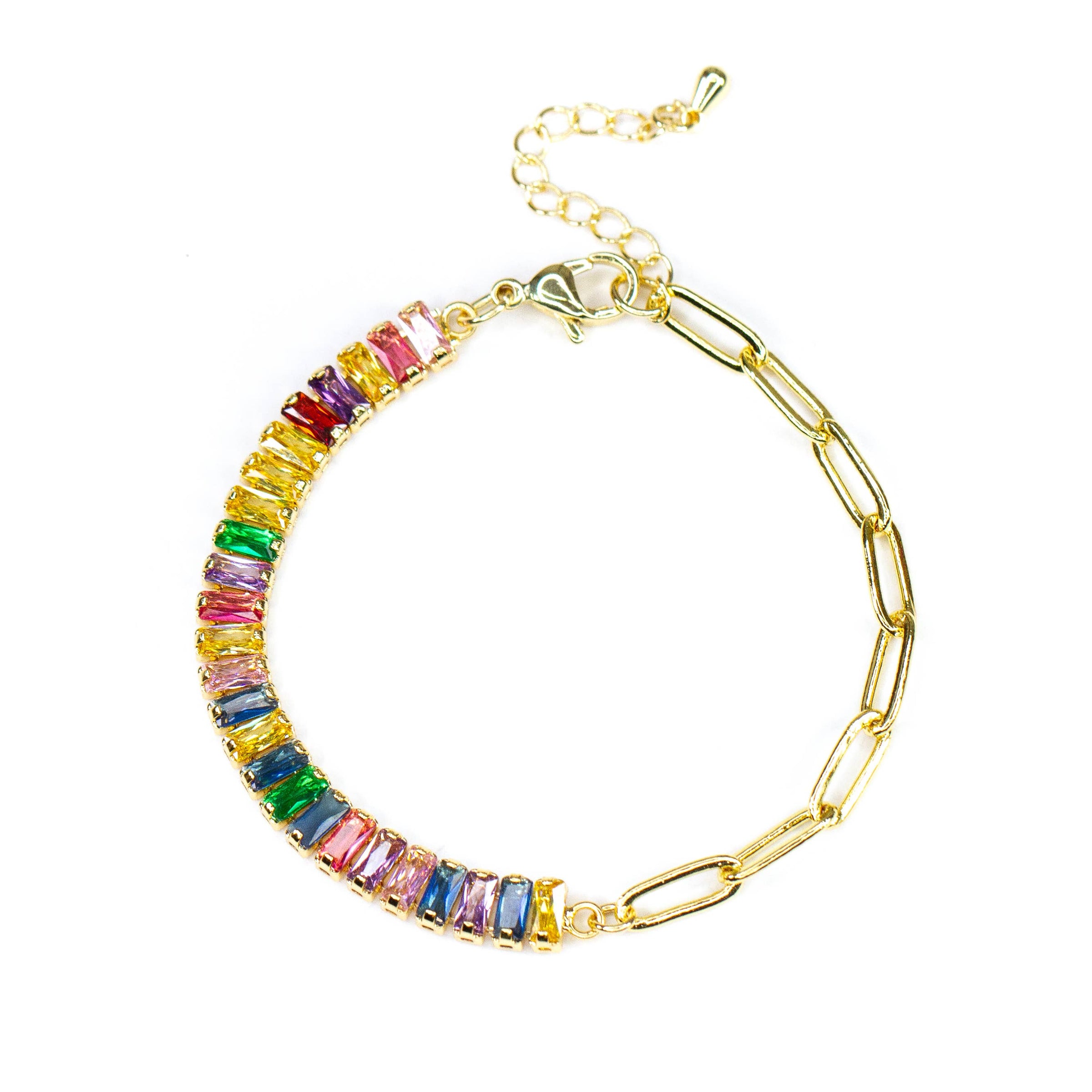 Tennis Multi Color CZ Baguette and Chain Link Bracelet