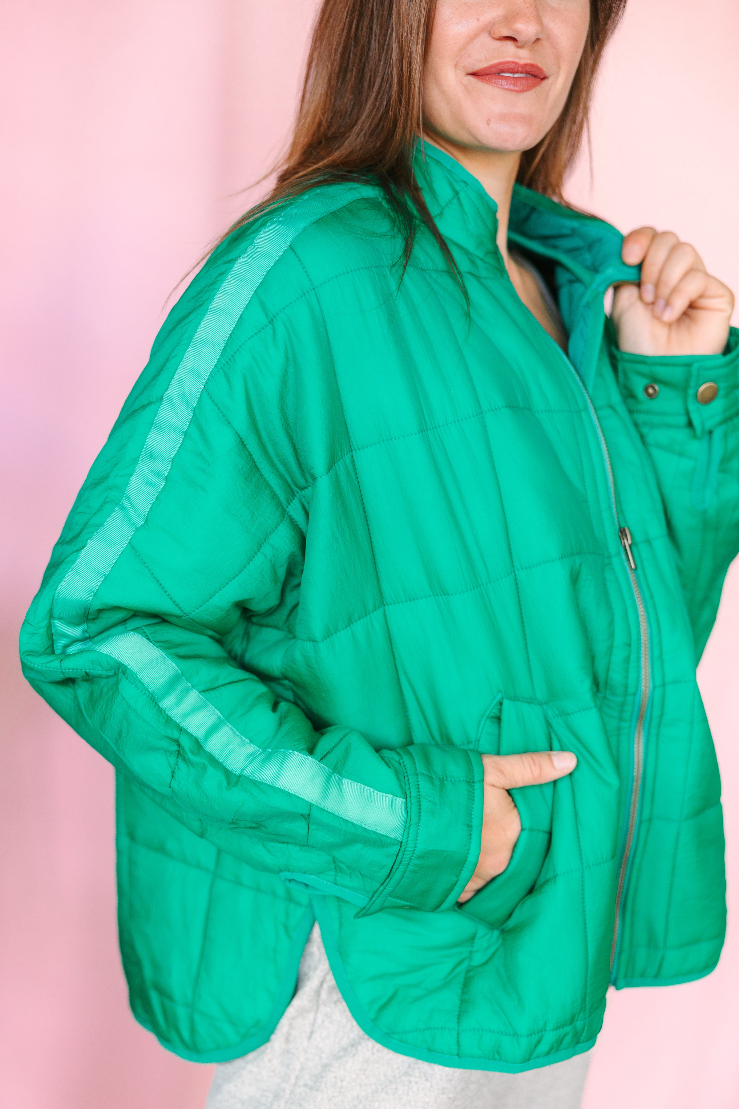 Stay cozy and chic in this Green Quilted Jacket—your new go-to layer for everything from casual coffee runs to weekend adventures. The quilted design adds texture and warmth without the bulk, while the green hue pairs effortlessly with any outfit in your closet. Whether you're layering over a dress or throwing it on with jeans, this jacket brings that perfect balance of comfort and style. Perfect for those in-between seasons when you need just the right amount of warmth with major fashion points.