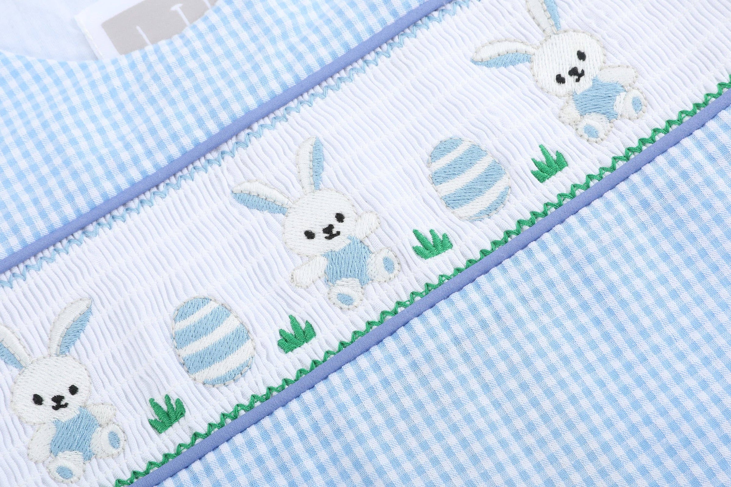 Light Blue Gingham Easter Egg and Bunnies Smocked Shortall