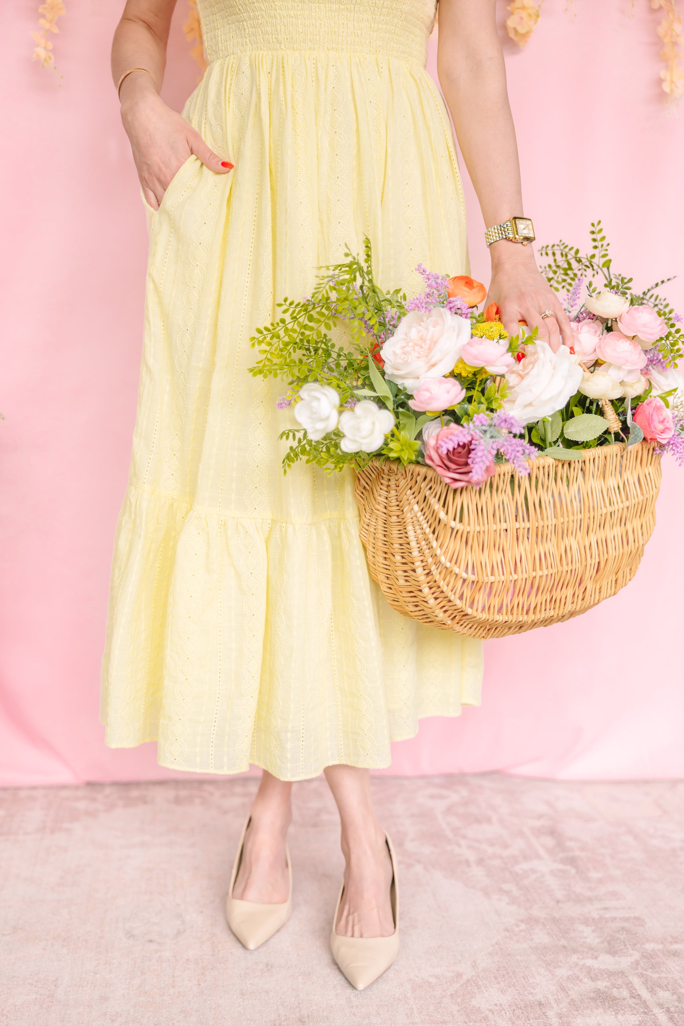 Get ready to twirl in this sunshine-yellow stunner! Crafted from breathable cotton eyelet, this maxi dress is basically a love letter to warm-weather style. The smocked front and back create a flattering silhouette, while the playful ruffle neckline and cascading tiered hem add just the right amount of whimsy. Fully lined for comfort and confidence, this dress is your ticket to looking effortlessly put-together at every occasion.